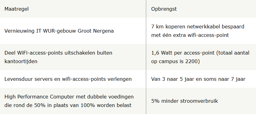 Ondertussen houdt het netwerkteam van IT ook in de gaten hoe de WiFi-apparatuur efficiënter te gebruiken is. ‘We zorgen bij nieuwbouw en verbouw voor goede WiFi-dekking en capaciteit en vaste internetverbinding waar nodig. Maar dan wel met zo min mogelijk apparatuur en energieverbruik.’ Waar dat op neer komt: telkens de perfecte puzzel proberen te leggen met netwerkkabels, netwerk switches, wifi-acces-points. ‘Per onderdeeltje scheelt dat misschien niet veel, maar de campus is groot, dus in totaal kunnen we veel besparen als we extra sturen op duurzaamheid van de IT-infrastructuur.’