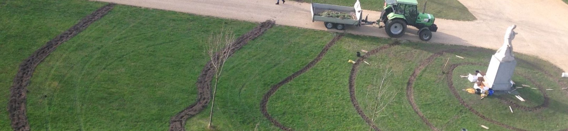 Rond het beeld de Zaaier voor het Atlasgebouw is een patroon aangebracht van lijnen. Hier zijn donderdag 24 november stroken van bloembolletjes ingeplant en Timoteegras gezaaid door de firma Donkergroen. De bollen en het gras vormen samen zogenaamde 'zaaisporen'.