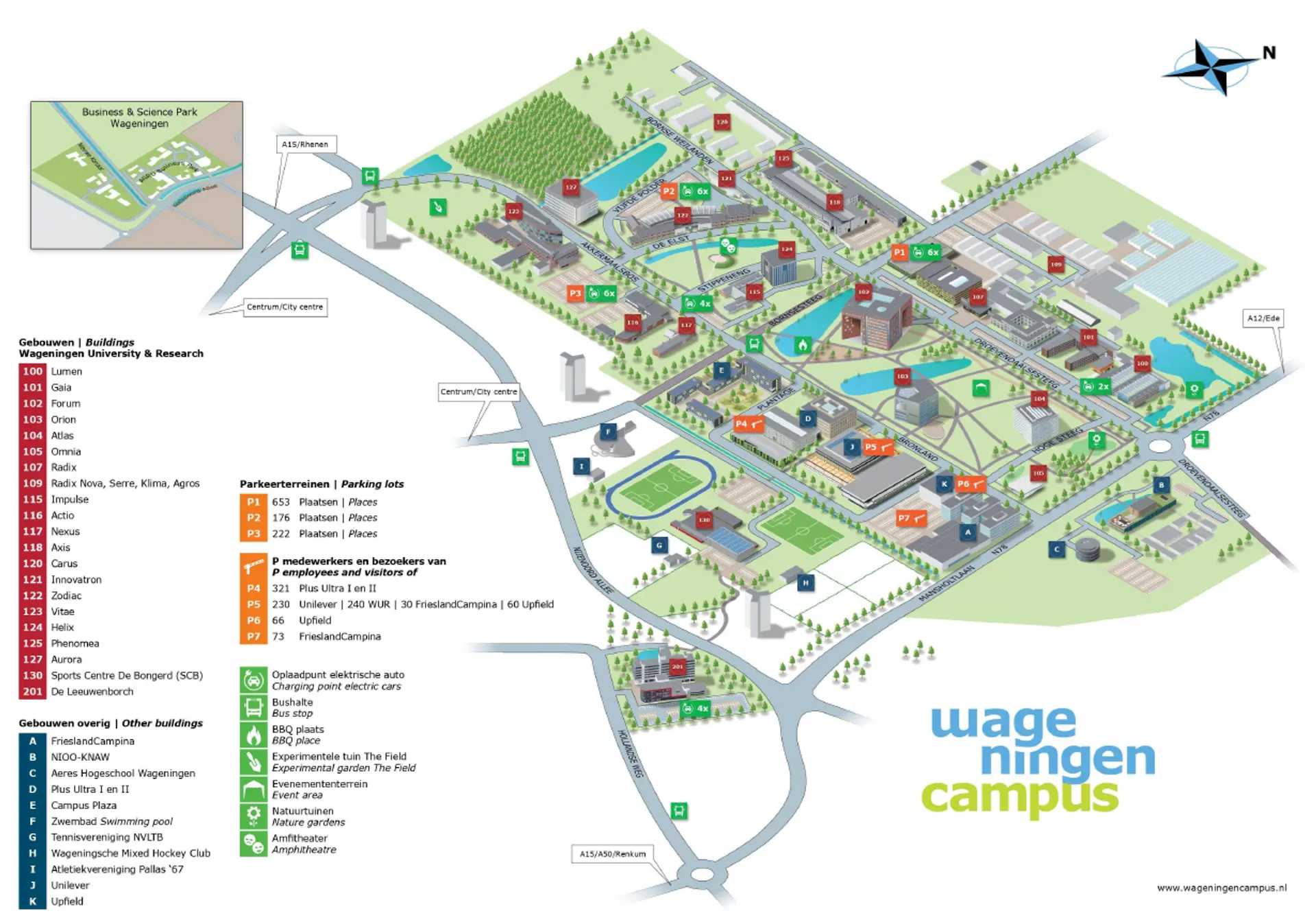 Met deze plattegrond vindt u snel de weg op Wageningen Campus. De plattegrond toont alle gebouwen met naam en nummer, als ook parkeerterreinen (inclusief laadpalen voor elektrische auto's), bushaltes en andere openbaar vervoerlocaties.